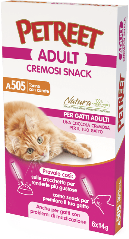 Gustosa crema al tonno Pinne Gialle con carote, ideale anche per gatti con problemi di masticazione.