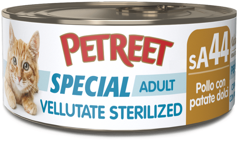 Alimento completo in crema con pregiato pollo e patate dolci, ideale per gatti sterilizzati.