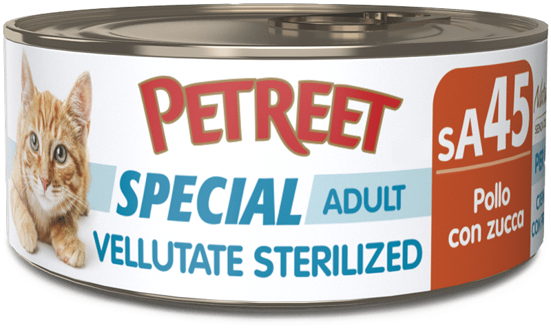 Alimento completo in crema con pregiato pollo e zucca, ideale per gatti sterilizzati.