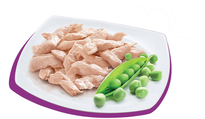 Alimento 100% monoproteico con pollo e piselli cotto in gustosa salsa naturale.