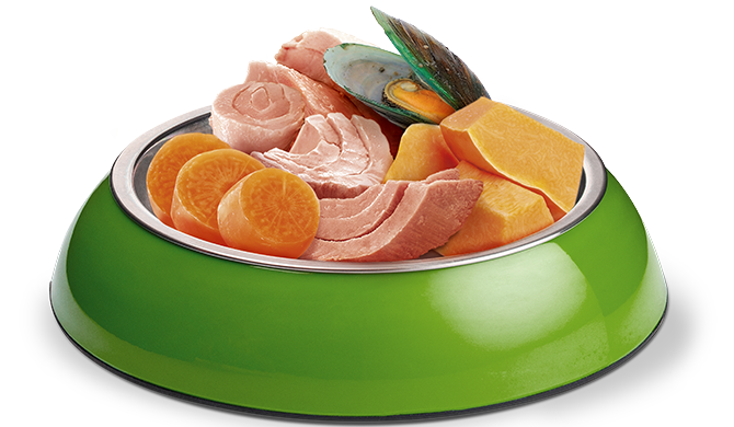 Alimento funzionale a base di tonno con carote e zucca, arricchito con cozza verde essiccata, per supportare un effetto benefico sulle articolazioni.